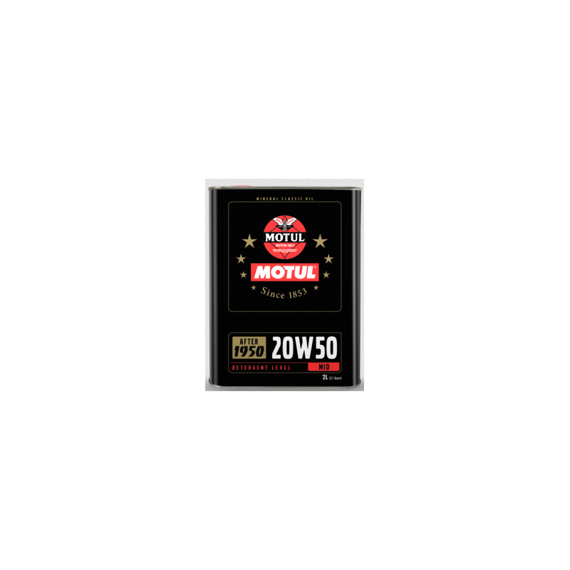 Conçu pour les moteurs construits entre 1950 et 1970. Lubrifiant minéral multigrade à teneur moyenne en détergent compatible avec les joints en élastomères. La 20W50 répond aux normes de l’époque (API SF / CC) tout en bénéficiant de l’avancée technologique des lubrifiants Motul. Viscosité adaptée aux jeux de fonctionnement resserrés des moteurs dû aux progrès importants de l’époque en matière de métallurgie, de fonderie et d’usinage.