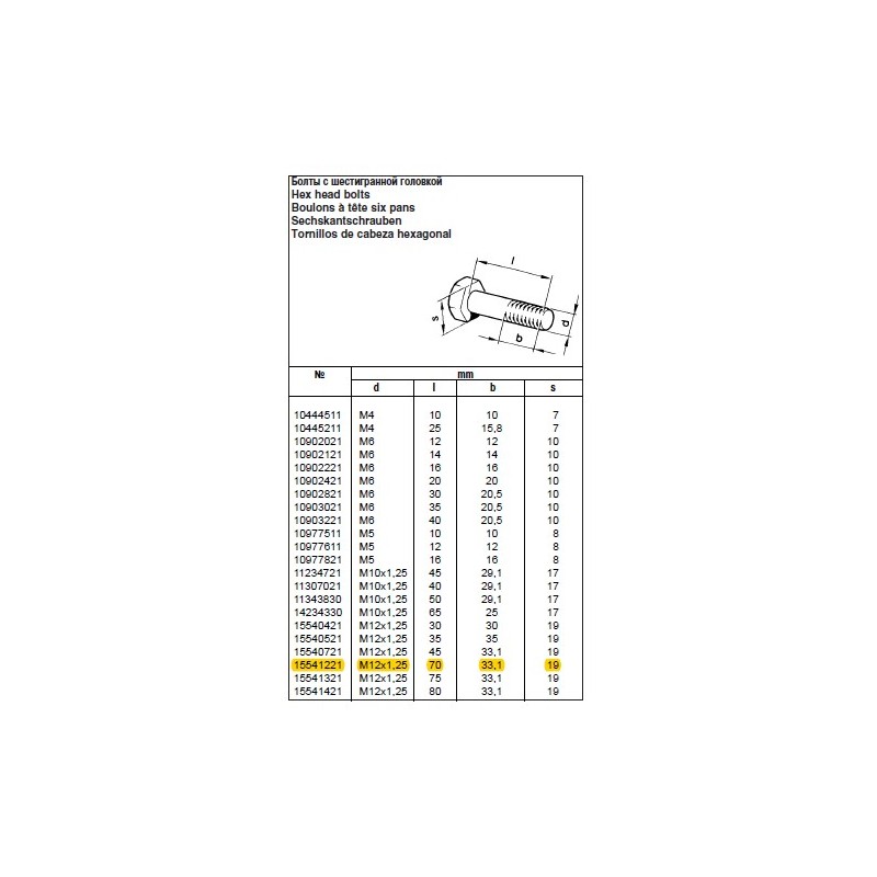 Boulon M12x1,25x70